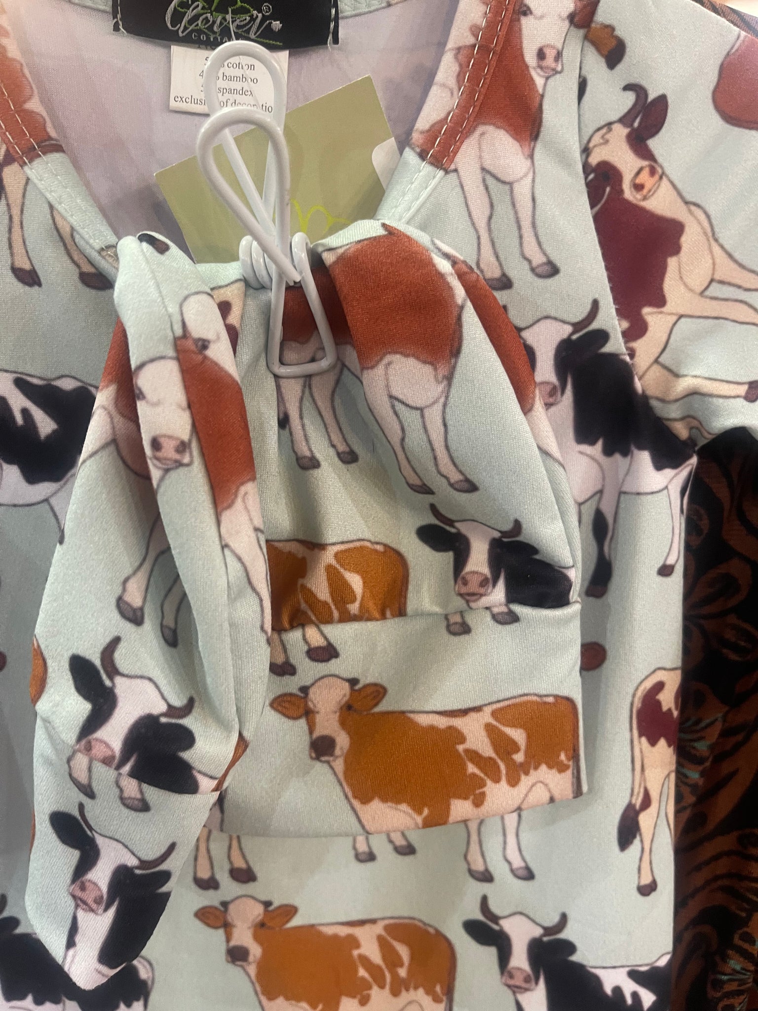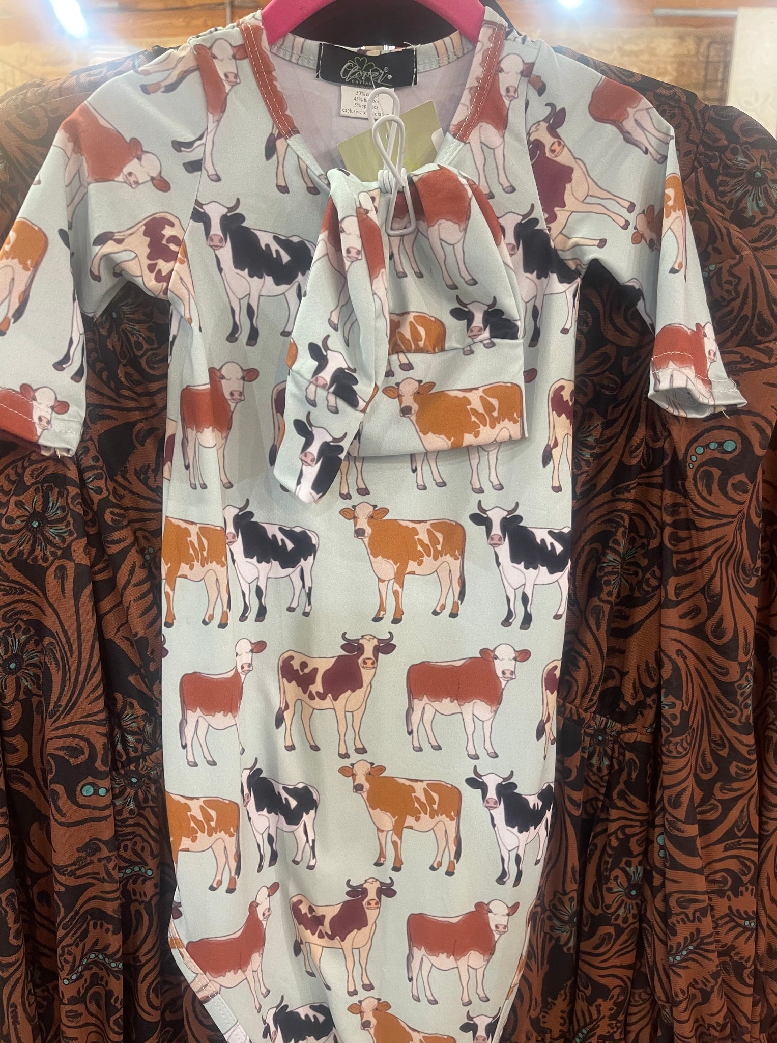 Get your little one moo-ving with the AQUA CATTLE BABY KNOTTED GOWN from Clover Cottage. The aqua background adds a unique touch, perfect for animal lovers. With its knotted design, this gown will keep your baby comfortable and stylish. Love your cows with this playful piece!