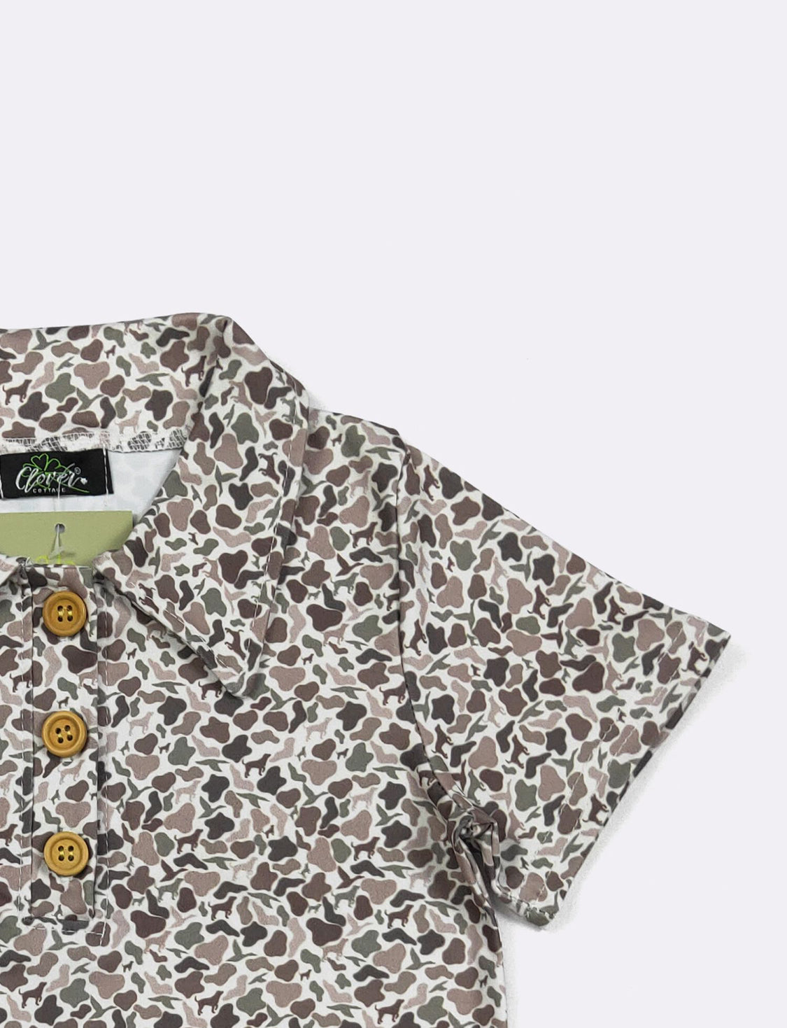 Step into the wild with Clover Cottage's Camo Hunter Collar Shirt, where style meets the great outdoors! This rugged camo number features adorable hunting dogs that'll have fellow sportsmen grinning from ear to ear. The classic camo color keeps you blended in nature while the charming collar design adds personality to your hunting wardrobe. Perfect for early morning treks, weekend adventures, or anyone who loves their canine companions as much as the hunt itself. Gear up with a shirt that celebrates the bond between hunter and hound!