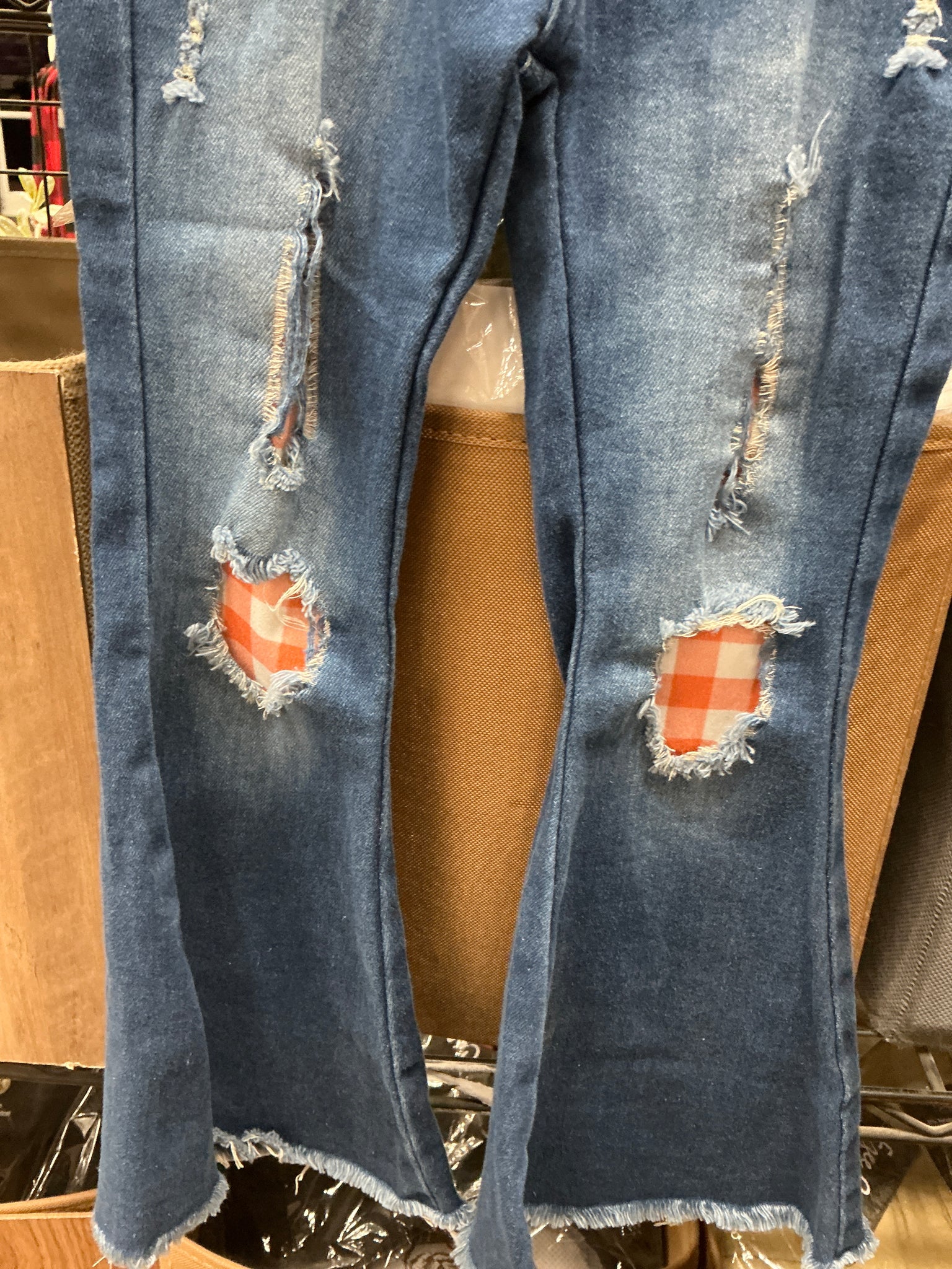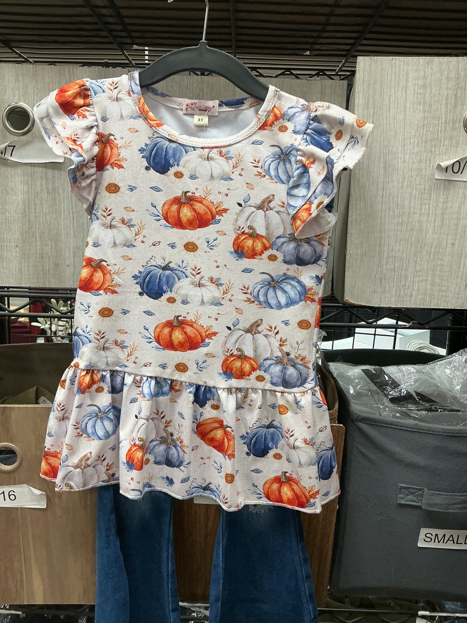 Get your little pumpkin ready for fall fun with the Denim Pumpkin Girls Set! This playful outfit pairs trendy jeans featuring cute tears and orange gingham patches with short-sleeve ruffle shirts adorned with charming orange and blue pumpkins. It's a cozy, stylish choice perfect for harvest days and pumpkin patch adventures.