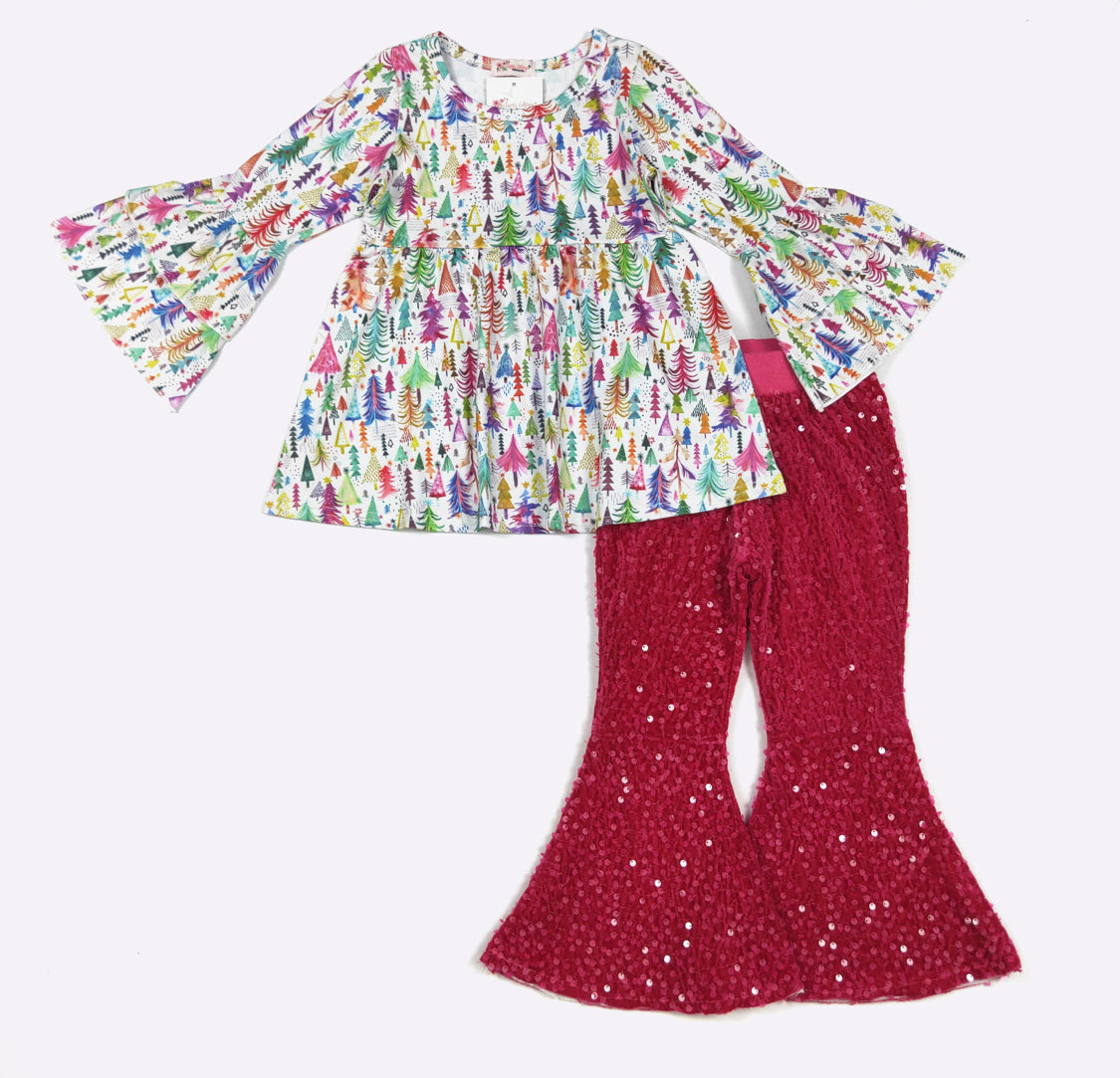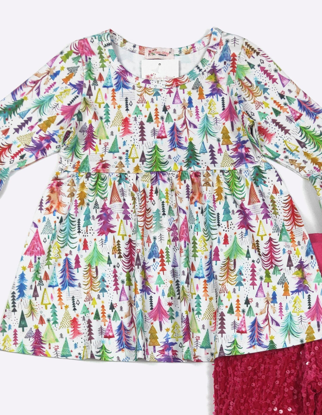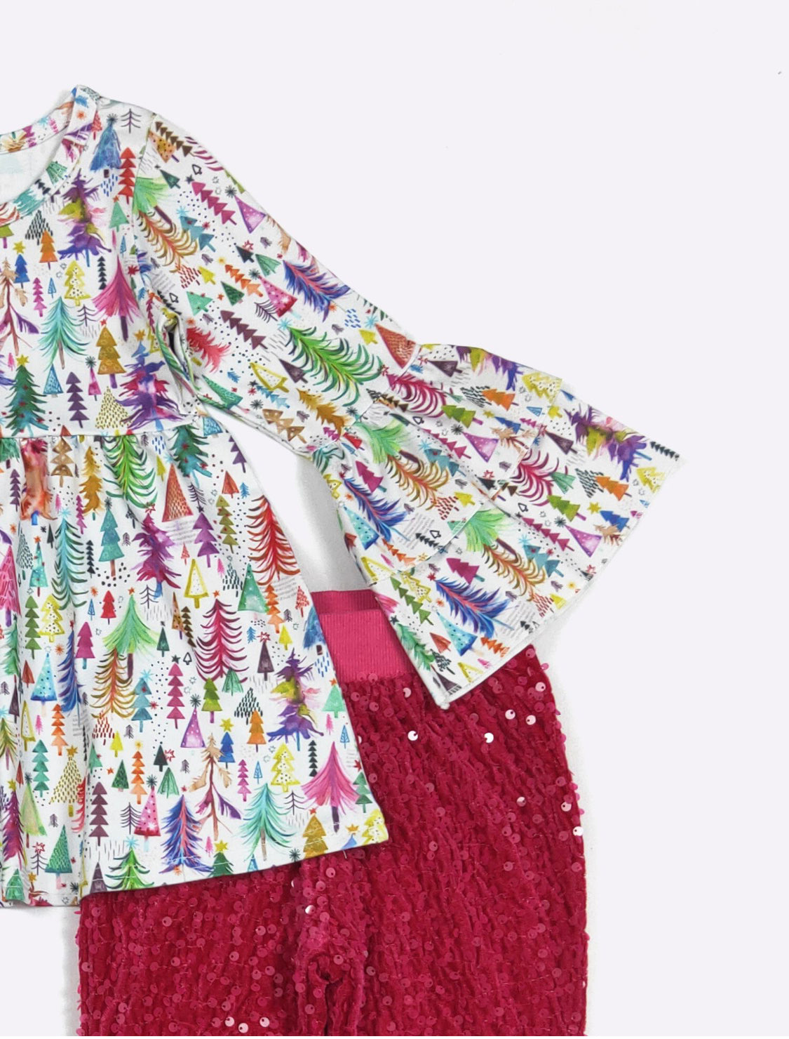 Let your little one sparkle this season with the Fantasy of Trees Girls Set! This cheerful ensemble features vibrant Christmas trees in a rainbow of colors paired with hot pink sparkle flare pants that add just the right amount of festive flair. Perfect for holiday parties, family gatherings, or spreading Christmas cheer wherever she goes. She'll love the fun, eye-catching style that makes her feel extra special during the most wonderful time of year.