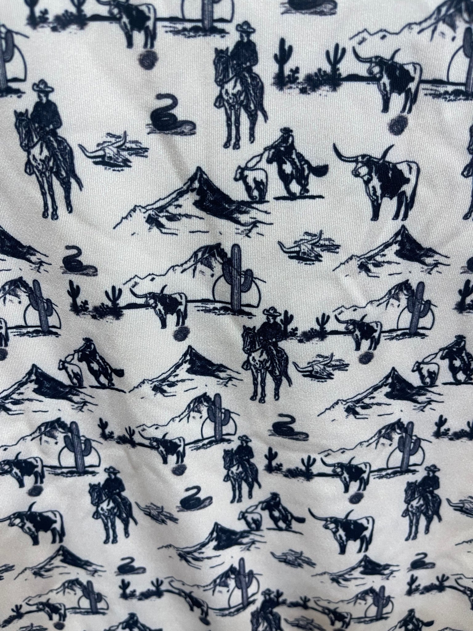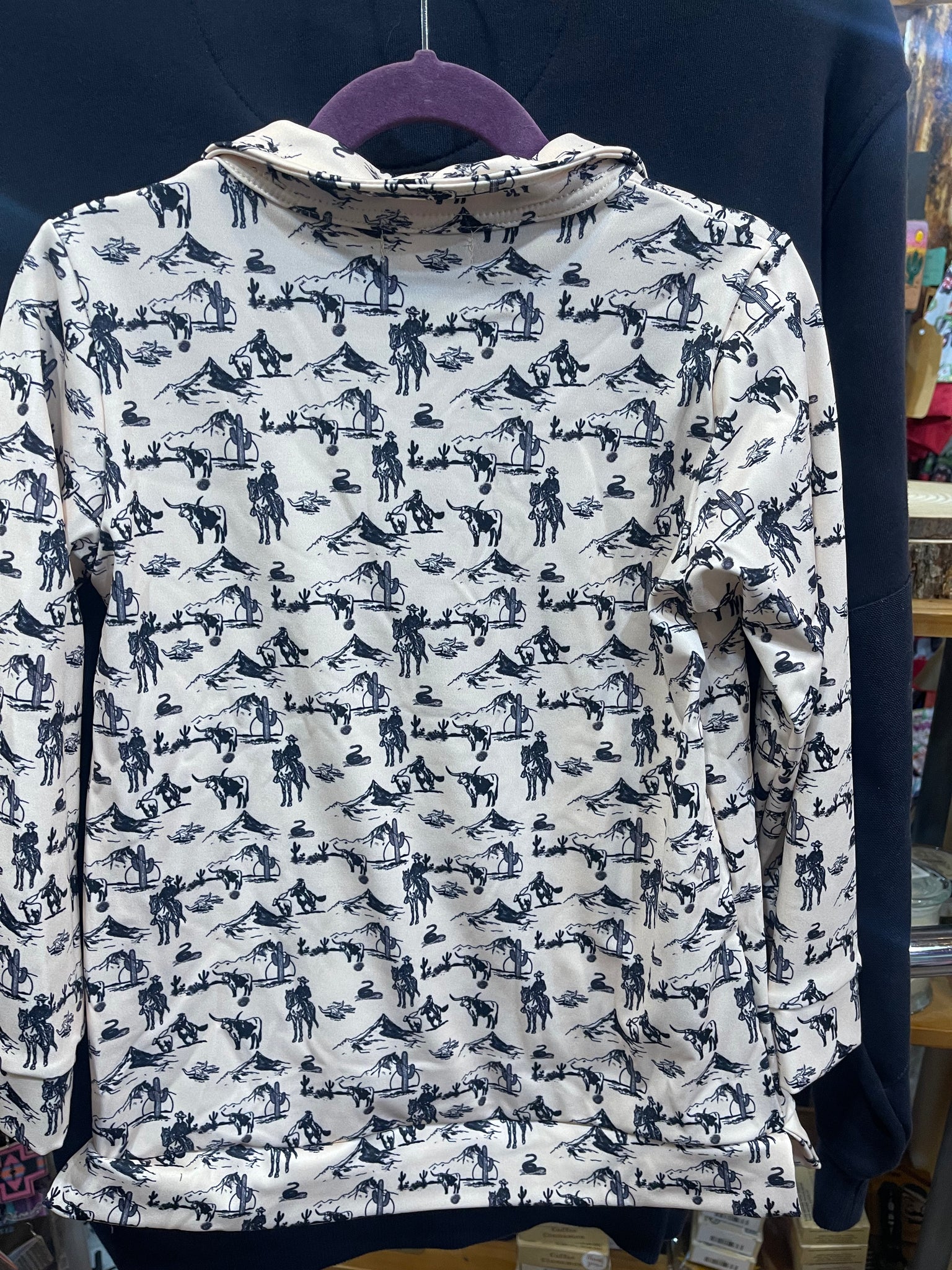 Saddle up for adventure in the Clover Cottage Frontier Quarter Zip! This playful piece brings the Wild West to life with charming cactus prints, spirited roping cowboys, and majestic mountain scenes. Perfect for anyone who loves that rugged frontier spirit with a touch of whimsy. Whether you're heading out for a day on the range or just want to channel your inner cowpoke, this quarter zip delivers style and comfort in one eye-catching package. Yeehaw!
