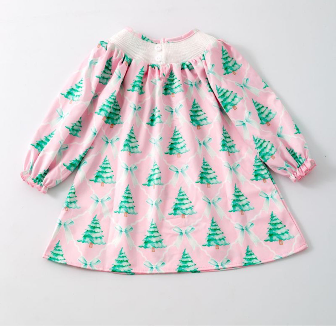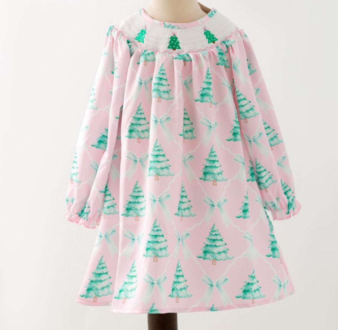 Twirl into the season in this charming, smocked girls dress from Clover Cottage! Featuring a soft pale pink background adorned with festive green Christmas trees and cheerful green bows, this dress captures holiday magic with a whimsical touch. The classic smocking detail adds texture and comfort, making it perfect for holiday parties, family photos, or special celebrations. A delightful choice for little ones who love festive style!