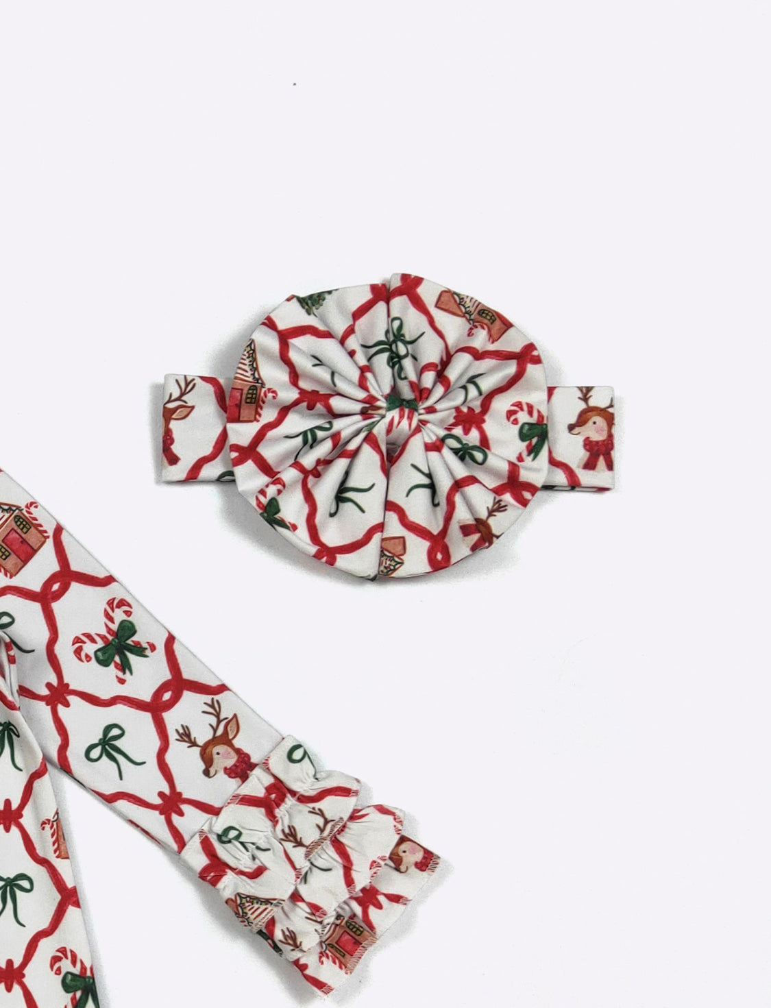 Dress your little one in holiday magic with this charming Clover Cottage Trellis Christmas Baby Gown. Featuring delightful festive motifs—a cheerful bow, prancing reindeer, jolly Santa, whimsical gingerbread house, and candy cane accents—this gown captures all the wonder of the season. The adorable bow detail adds an extra touch of sweetness, making it perfect for holiday photos, celebrations, and cozy winter nights. Soft, comfortable, and bursting with seasonal cheer, this gown is sure to become a treasured favorite.
