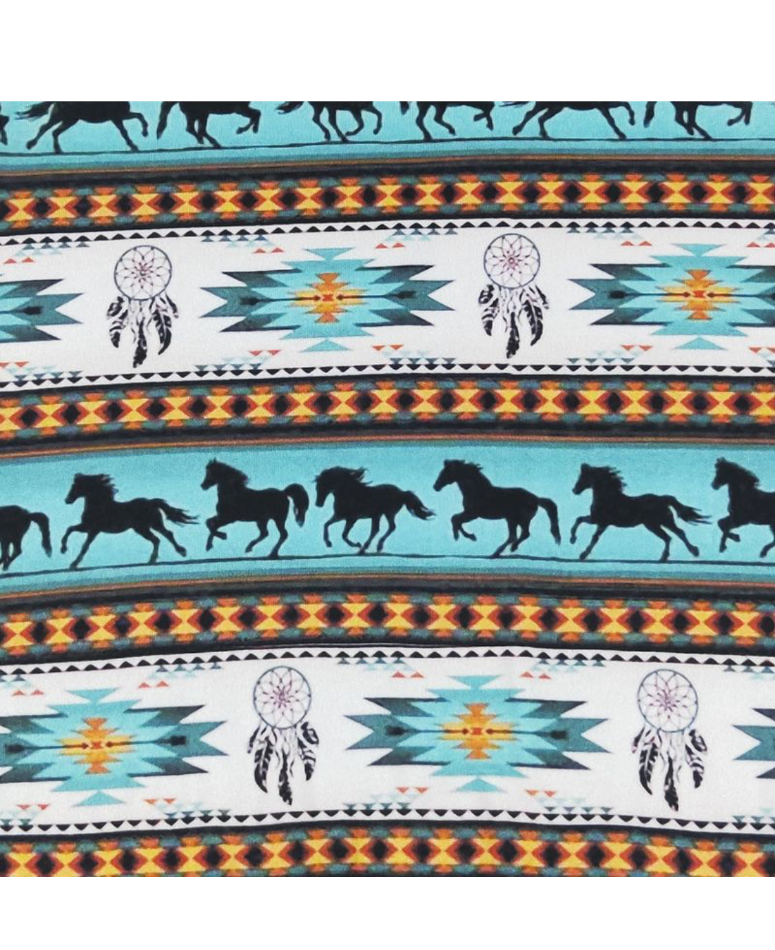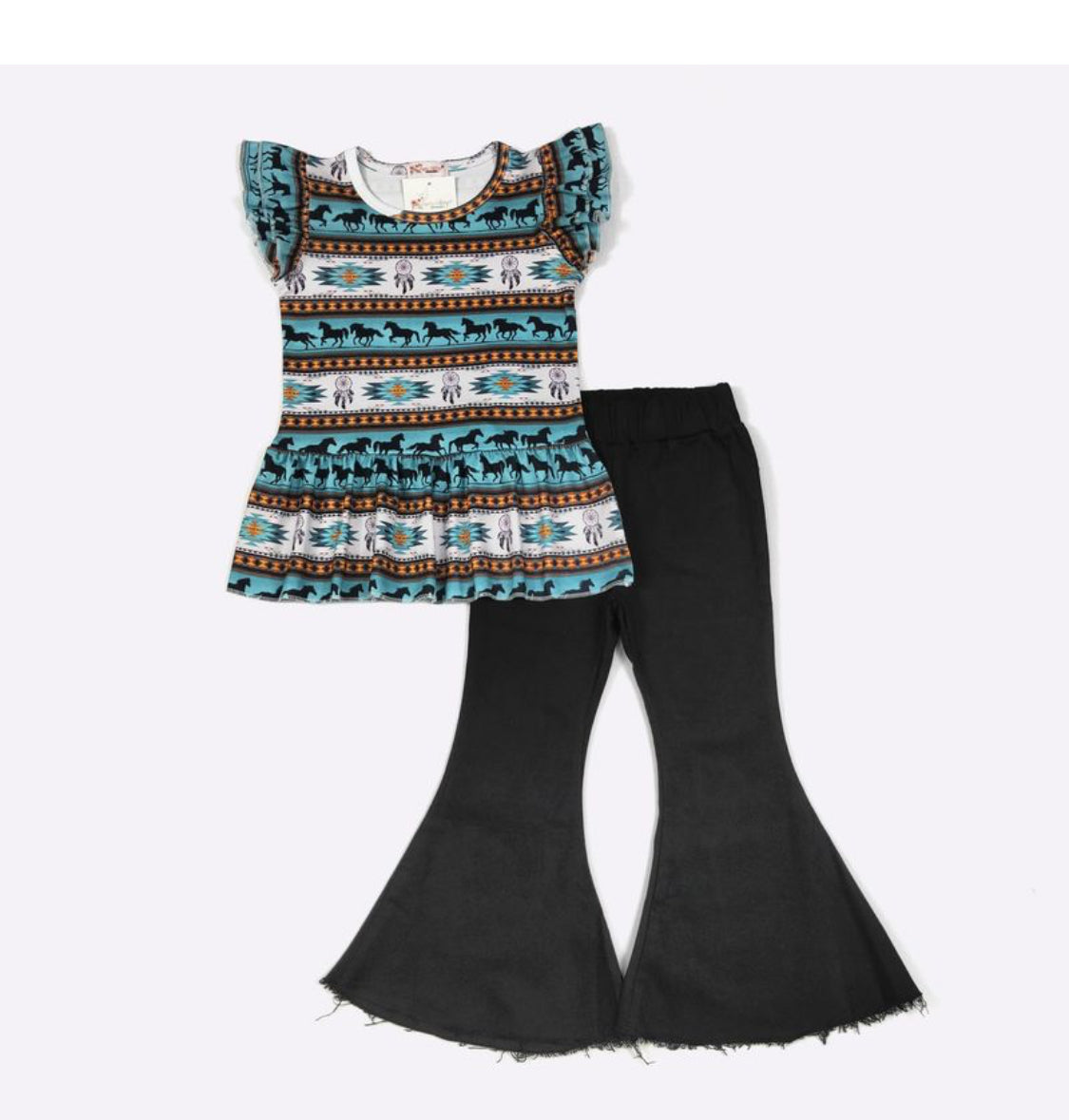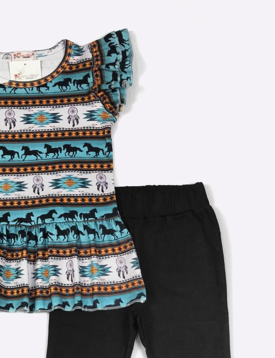 Saddle up for adventure in this vibrant Clover Cottage girls set! Featuring spirited horses prancing across a stunning turquoise backdrop, this playful ensemble showcases bold Aztec-inspired patterns in cheerful yellow and crisp white accents. Perfect for the young equestrian enthusiast who loves mixing cultural flair with fun fashion, this set brings together style and imagination in one eye-catching package. Let her gallop through her day in comfort and colorful confidence!